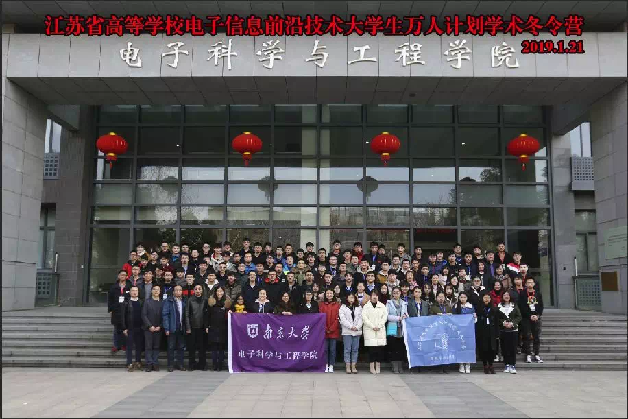 为贯彻《中共中央办公厅国务院办公厅关于深化教育体制机制改革的意见》精神,服务国家创新驱动发展战略,落实立德树人根本任务,推进产学研合作协同育人,着力培养各行各业未来领军人才,江苏省教育厅启动高等学校大学生计划,开展2018-2019年学术冬令营活动。我校信息院共5名同学:电子信息工程:160802108杜维,物联网工程:160805320吴倩文、160805326张慧、1603A0507侯虎,电气工程及其自动化:160803127于慧振,通过校内推荐和南京大学专家组审核选拔,最终入选了江苏省高等学校电子信息前沿技术大学生计划学术冬令营。2019年1月21日上午9点,冬令营启动仪式在南京大学电子科学与工程学院报告厅举行