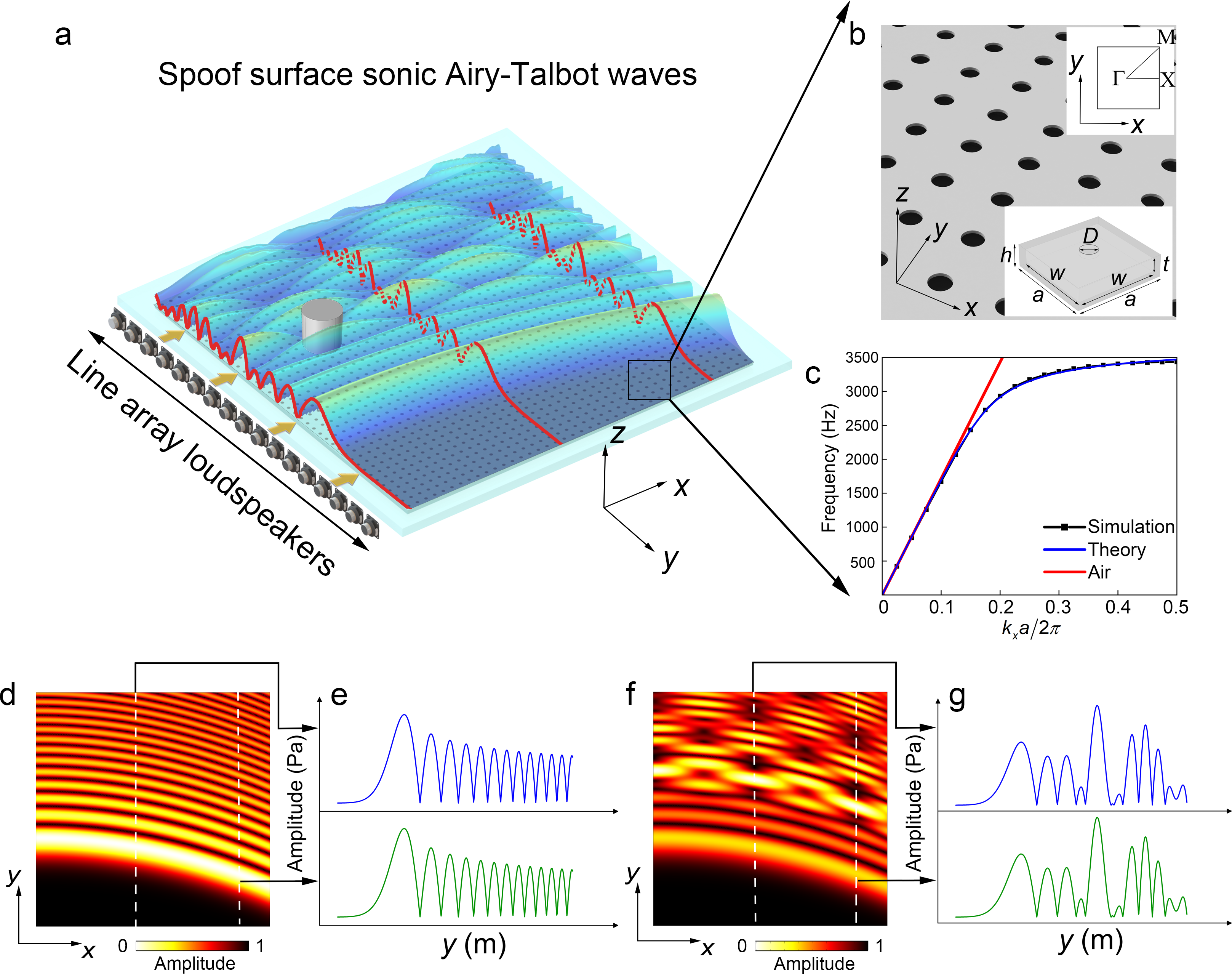 据悉,Airy-Talbot效应可以沿着弯曲轨迹以固定间隔不断复现成像,打破了传统自成像效应中只能沿直线传输的限制。目前,Airy-Talbot效应在声学领域复现极具挑战。本研究提出一种基于声学人工表面验证Airy-Talbot 效应的设计方案,为缓解声衰减和衍射方面的问题,将亥姆霍兹共鸣器作为超表面的结构单元,以伪表面波模式支持艾里束的长程传播。基于伪表面波扁平的色散曲线特征,研究者验证艾里束的波包在被显著压缩的同时能够进一步延伸无衍射距离,实现了突破声波衍射极限的高分辨率成像。
